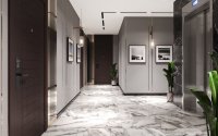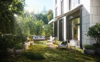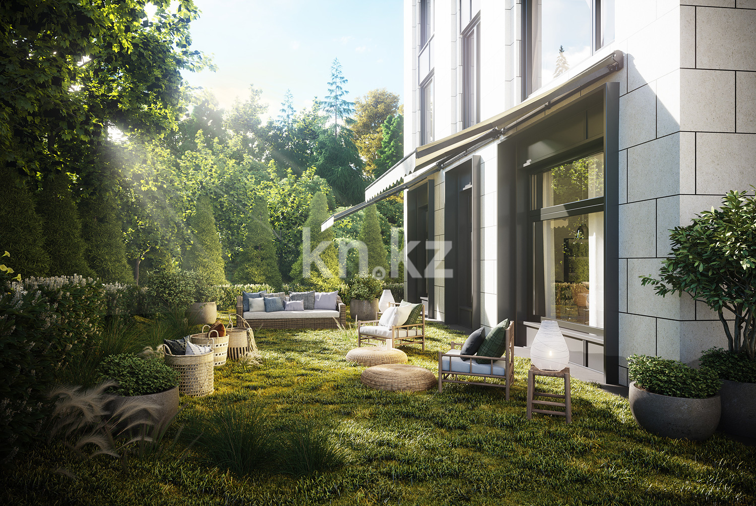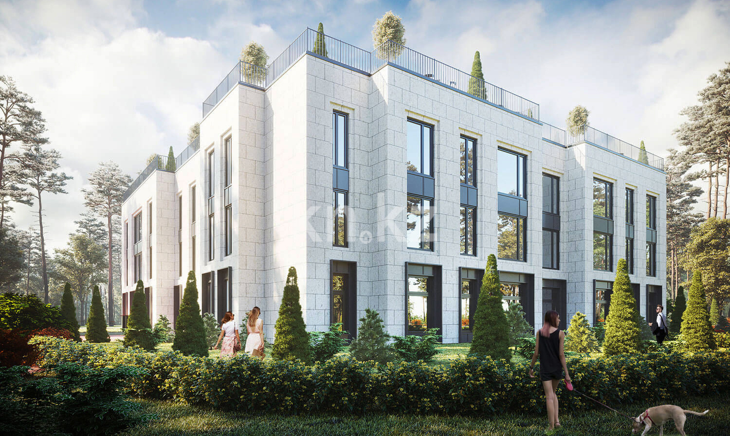 КД Esentai terrace – трехэтажный дом элит-класса, спроектированный в стиле неоклассика. Фасад, выполнен в светлых оттенках. На крыше обустраивается общая зона отдыха площадью 600 кв. метров, оборудованная беседками, перголами и зоной барбекю. На террасе высаживаются редкие растения и кустарники.
