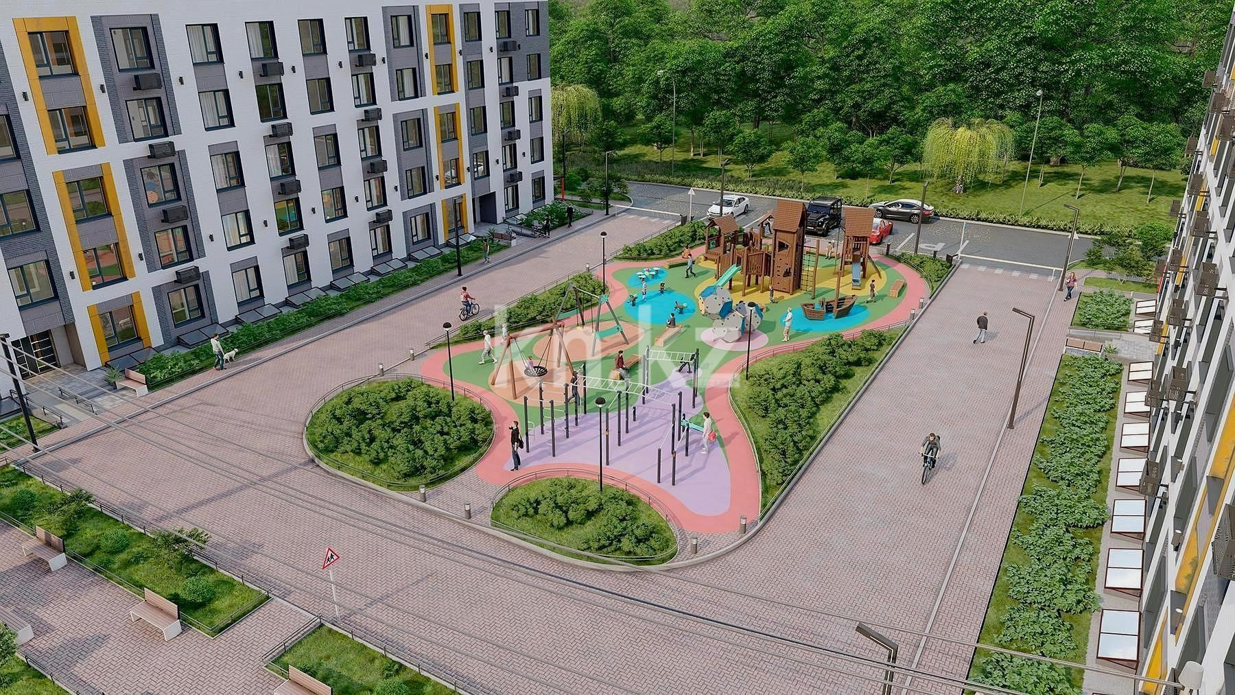 Двор комплекса спроектирован для отдыха и активного образа жизни. Здесь расположены детские игровые площадки, спортивные зоны и зоны отдыха, подходящие для семейного проживания. Асфальтированные дороги и прогулочные дорожки с плиточным покрытием подчёркивают аккуратность и стиль территории, а стильные уличные фонари добавляют гармонии.
