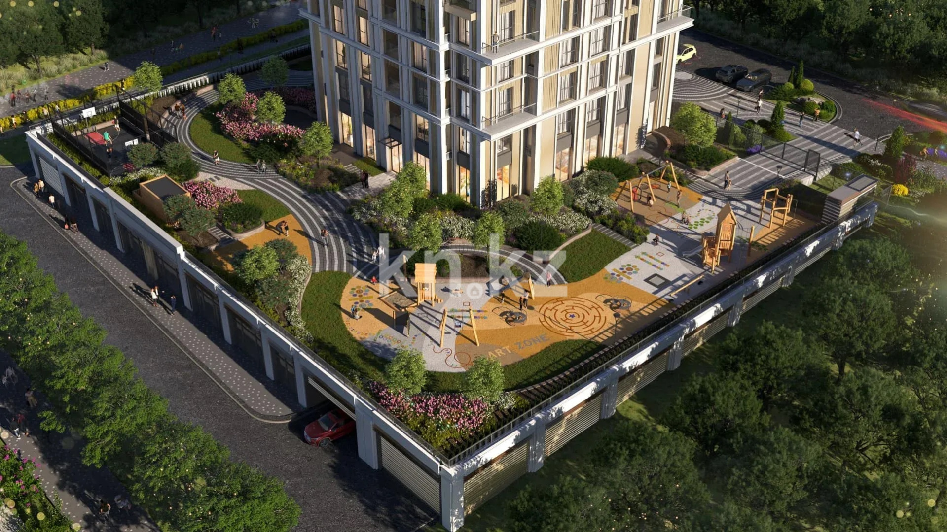 Территория комплекса объединяет несколько зон, где каждый найдет занятие по душе. Для детей — площадки из натуральных материалов, для взрослых — уютные lounge зоны и площадки workout.