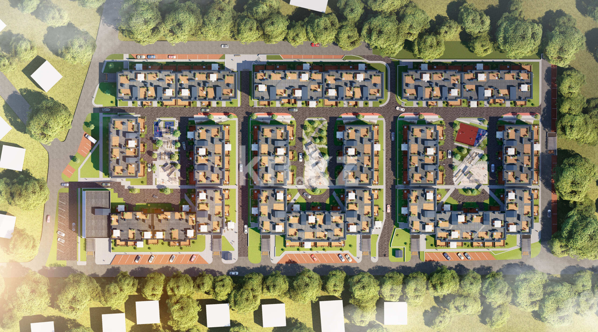 Асфальтированные проезды ведут к парковочным местам.