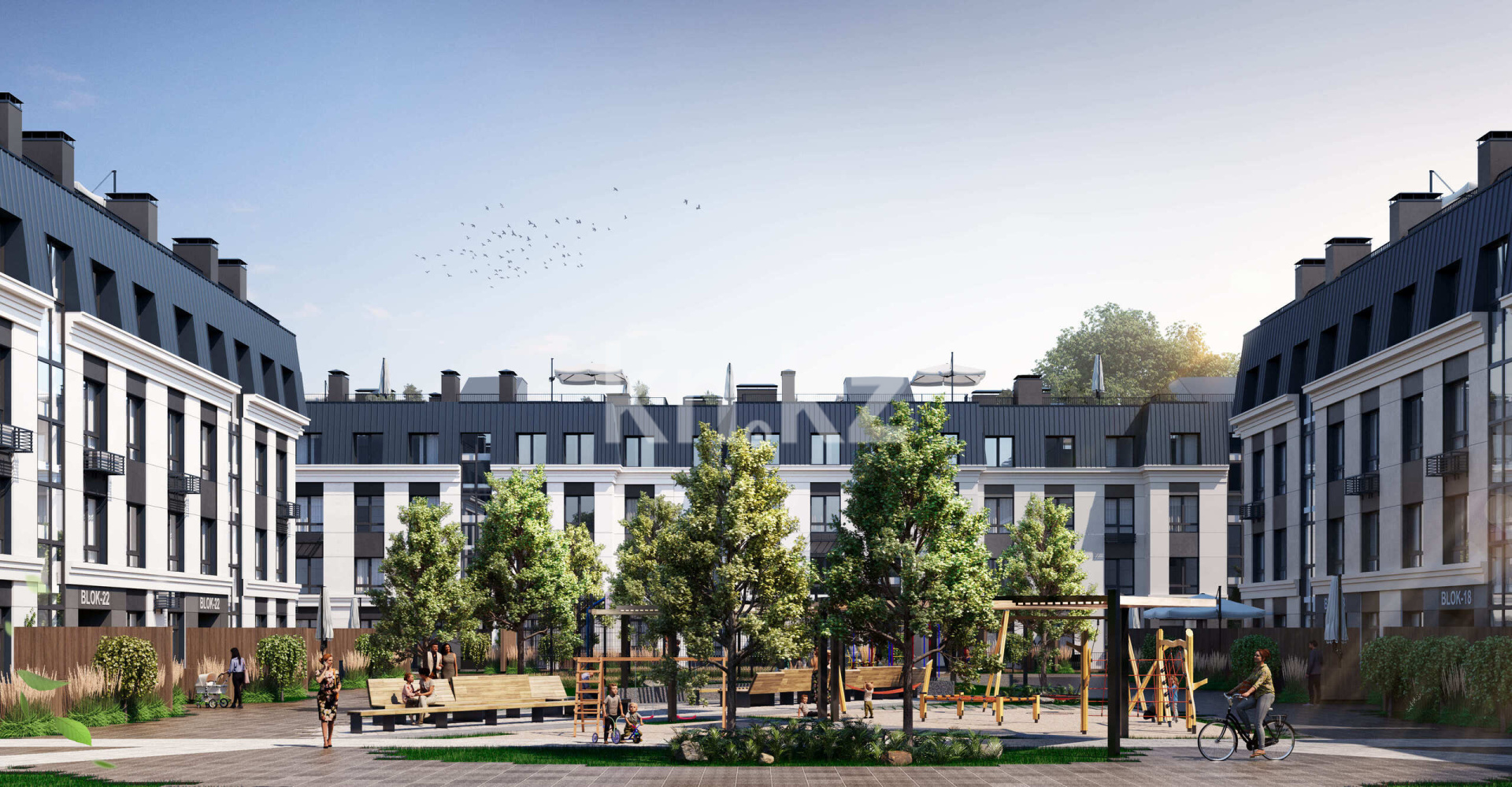 Комплекс образует три отдельные дворовые зоны, соединенные пешеходной аллеей с зонами отдыха. Весь автомобильный трафик вынесен за пределы дворов, что обеспечивает тишину и безопасность для жителей. Территория комплекса находится под круглосуточной охраной и видеонаблюдением.