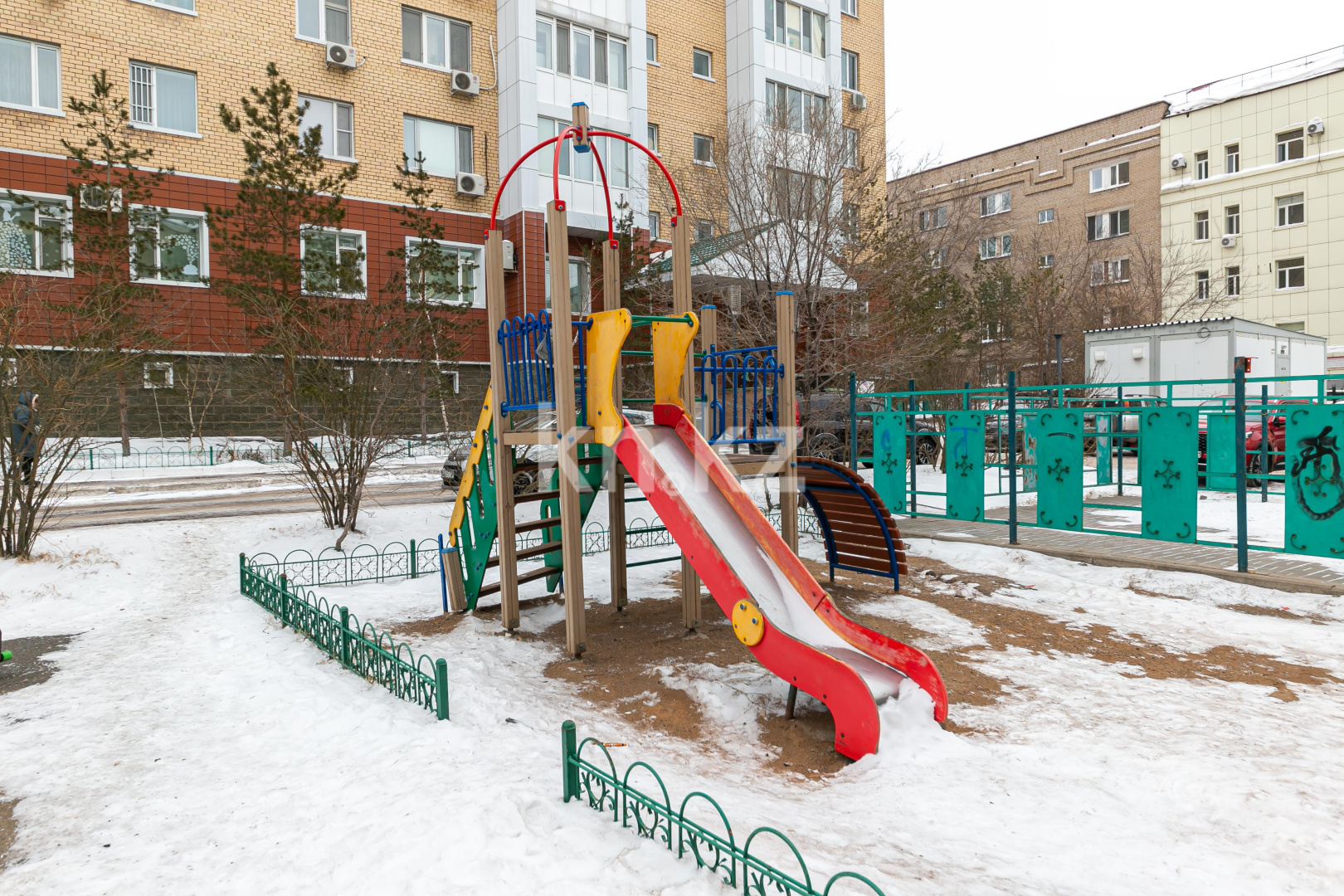 Дворовую территорию ЖК делит с соседней панельной пятиэтажкой. Двор не огорожен, но богато оснащён детскими игровыми комплексами и уличными тренажёрами. По периметру расставлены скамейки. Возле дома есть места для парковки машин. Во дворе есть детская площадка с полем для мини-футбола.