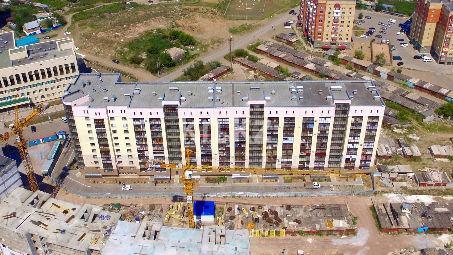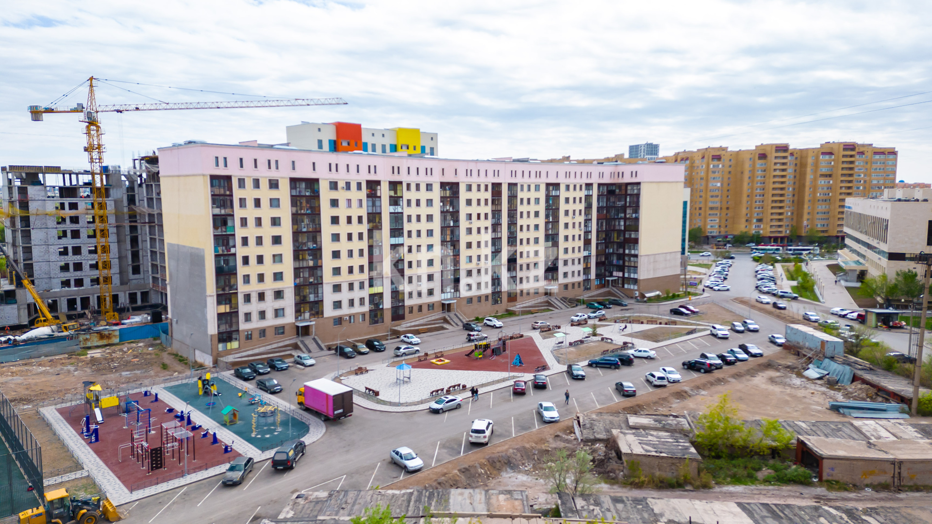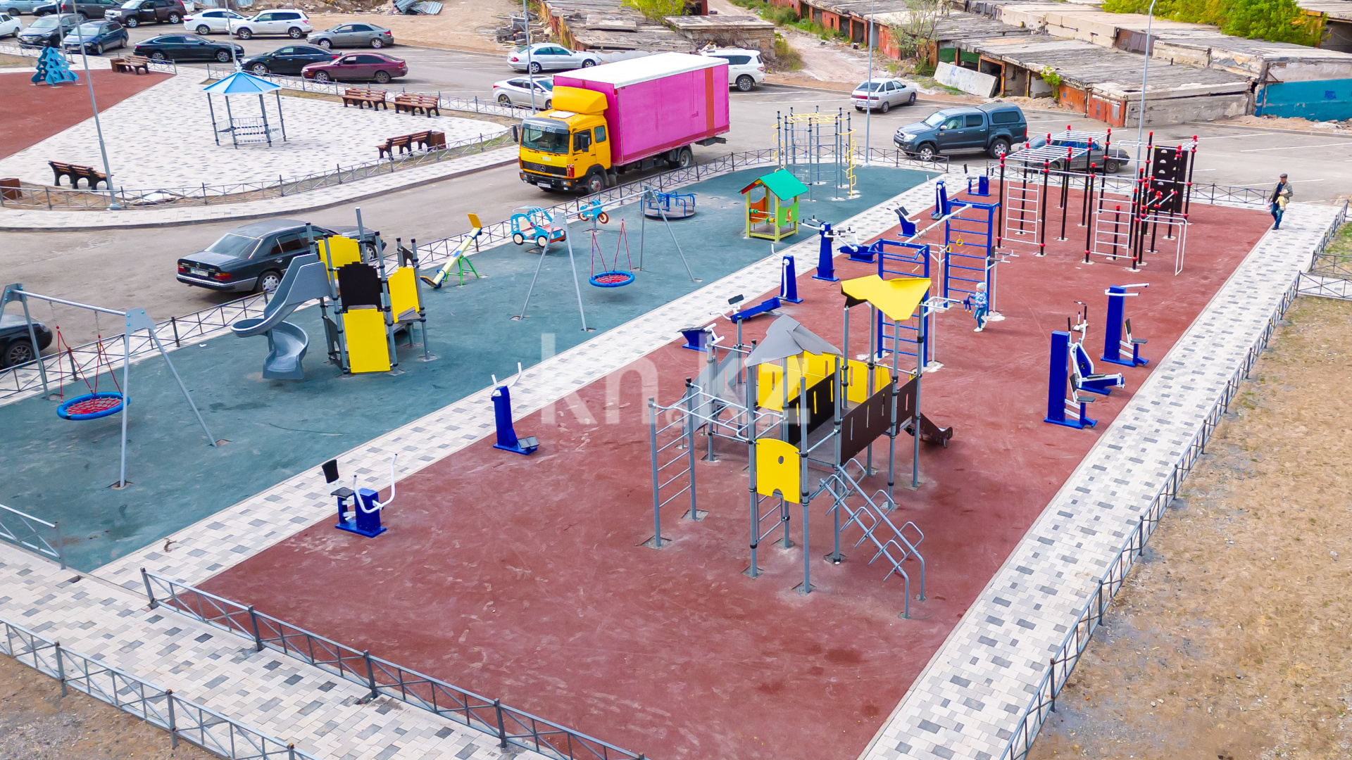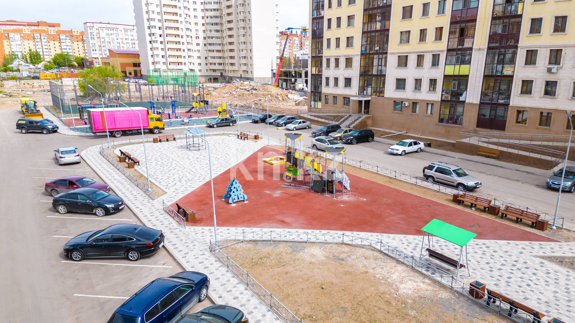 Двор жилого комплекса узкой полосой вытянут вдоль дома. На этой территории расположены газоны, тротуар, заасфальтированный проезд.