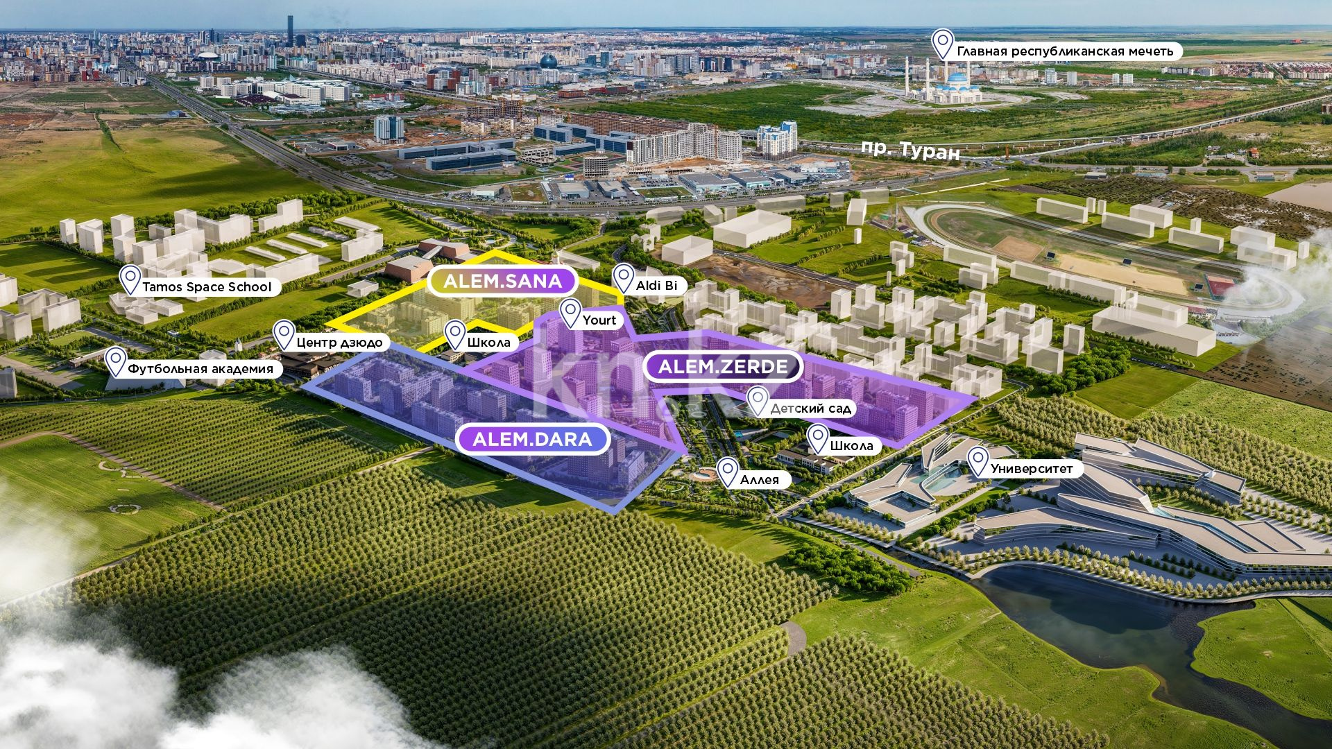 ЖК Alem Sana — это современный жилой комплекс, создаваемый компанией BI Group и расположенный в Астане, на пересечении проспектов Туран и Кабанбай батыра, что обеспечивает удобную транспортную доступность и близость к ключевым городским точкам.