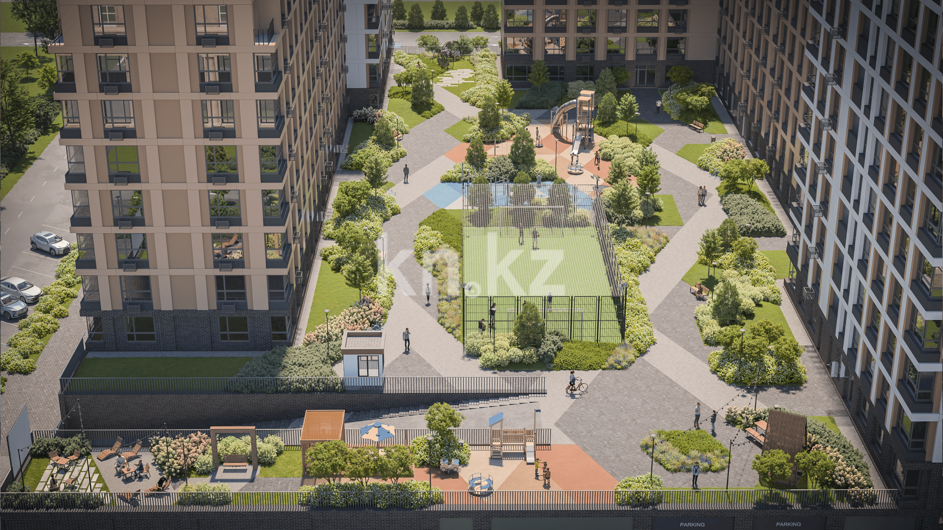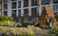 Благоустройство территории комплекса продумано для активной и семейной жизни: круглосуточное видеонаблюдение обеспечивает безопасность, а закрытый двор позволяет создать приватное пространство. На территории предусмотрены детские и спортивные площадки, а также зоны отдыха, озеленённые участки и ландшафтный дизайн — все это создаёт атмосферу спокойствия и гармонии. Особенной опцией является кинотеатр под открытым небом, что даёт жителям возможность собираться на вечерние просмотры под звёздами. Для автомобилистов предусмотрен наземный паркинг.