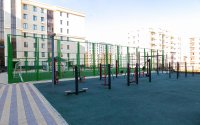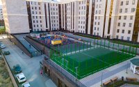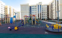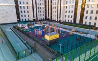 Безопасный двор с детскими площадками и ландшафтным дизайном.