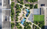 Особое внимание уделено благоустройству территории. Двор, расположенный на уровне первого этажа, создает приватное и безопасное пространство для жителей. Здесь предусмотрены озелененные зоны отдыха, прогулочные аллеи, современные детские игровые площадки и спортивные зоны. Такая среда идеально подходит как для активного досуга, так и для спокойного отдыха всей семьей.