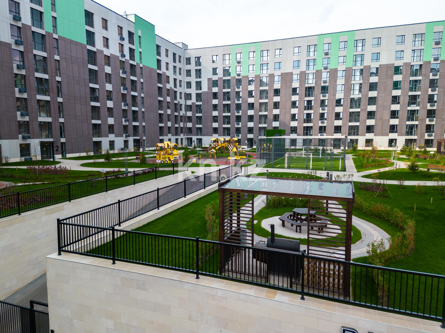 Внутренняя территория закрыта для машин и посторонних лиц. Безопасность жителей обеспечивают камеры круглосуточного видеонаблюдения, установленные по периметру комплекса и система контроля доступа с функцией распознавания лиц.