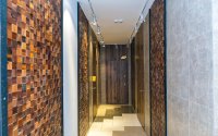 Наружные стены сооружены из кирпичей и утеплены высококачественным теплоизолятором. Фасад оформлен клинкерным кирпичем и фиброцементными панелями и украшен ночной подсветкой в темное время суток.