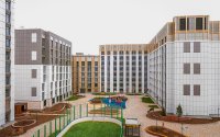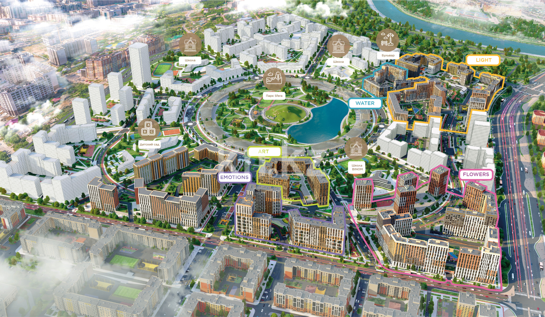 Благоустройство территории выполнено с акцентом на комфорт и безопасность жителей: оборудованы прогулочные аллеи, озеленённые дворы, детские и спортивные площадки, установлены системы видеонаблюдения и охраны. Пространство организовано в стиле современного городского парка — с зонами отдыха для взрослых и малышей, декоративным освещением и удобными местами для прогулок.