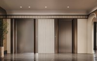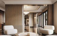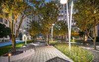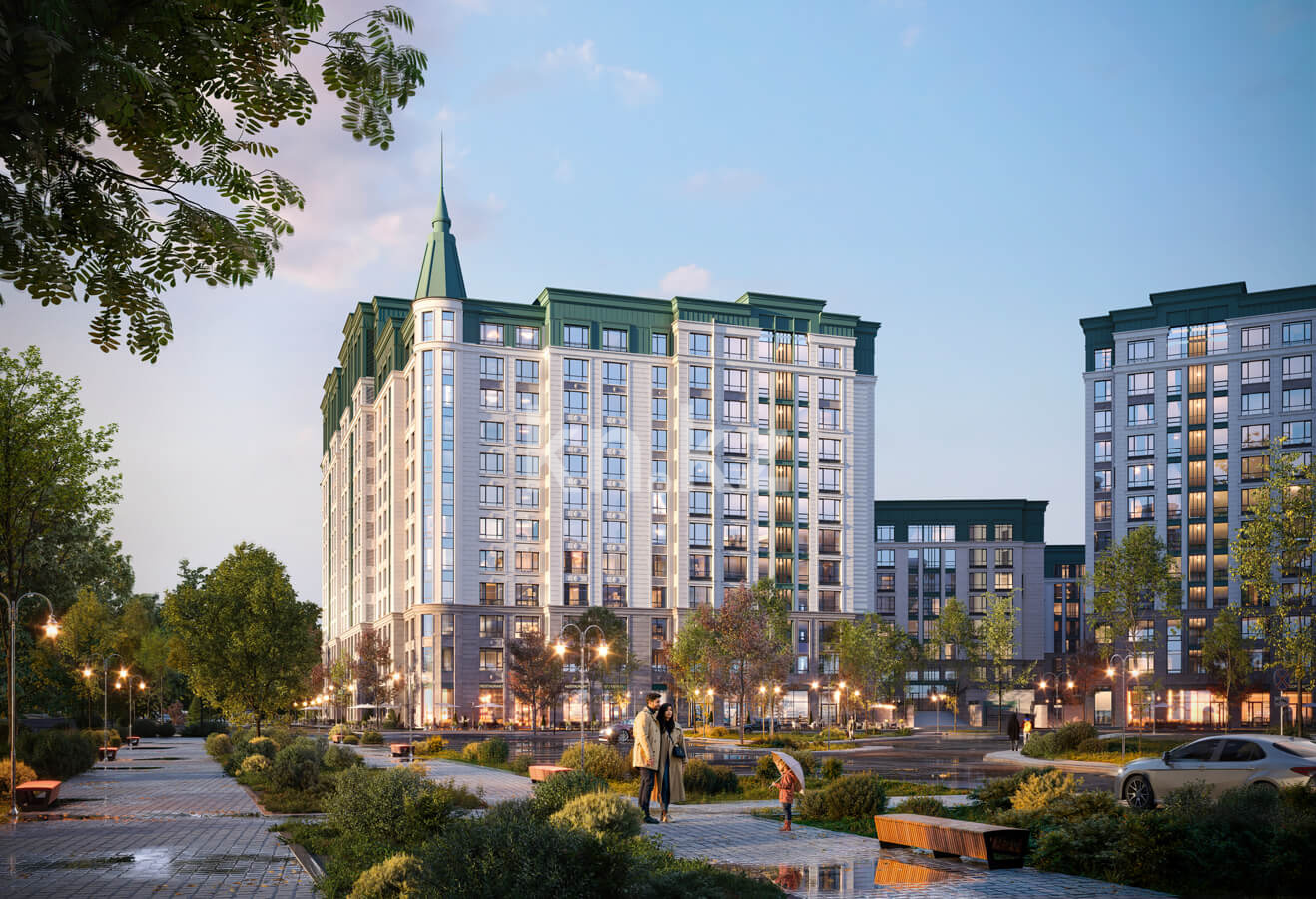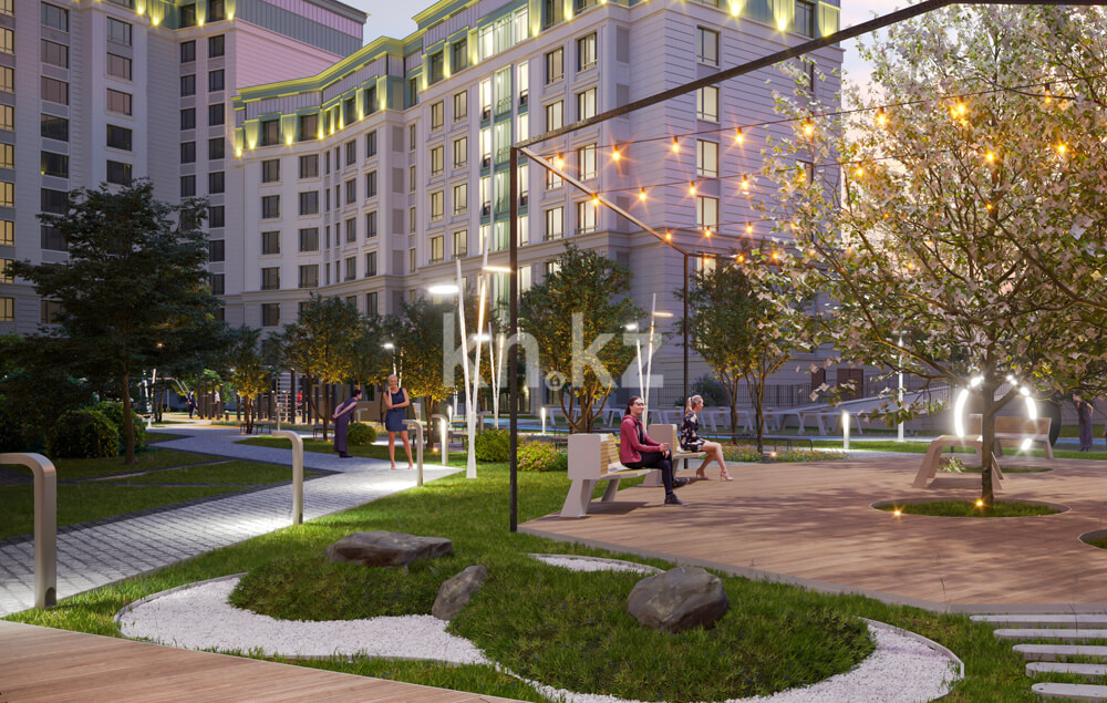 Внутреннее пространство комплекса организовано как закрытый двор-парк, доступный только жителям. Ландшафтный дизайн сочетает в себе хвойные и лиственные деревья, декоративные миксбордеры и сухой ручей, оформленный морской галькой и природным камнем. Это пространство идеально подходит для прогулок, отдыха и тихого досуга на свежем воздухе.