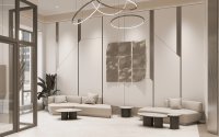 Продуманное зонирование, высокие потолки и панорамное остекление входных групп наполняют пространство естественным светом, а минималистичные арт-объекты добавляют интерьеру эстетическую глубину.