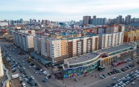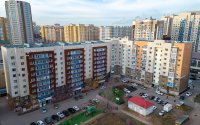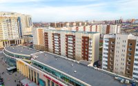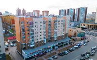 С наружной стороны здание жилого комплекса имеет выступающую часть, в которой расположены коммерческие помещения.
