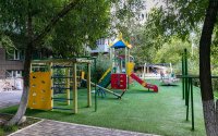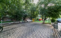 Прилегающая территория огорожена, на въездах установлены шлагбаумы. Во дворе размещены скамейки, беседки, детская и спортивная площадки.