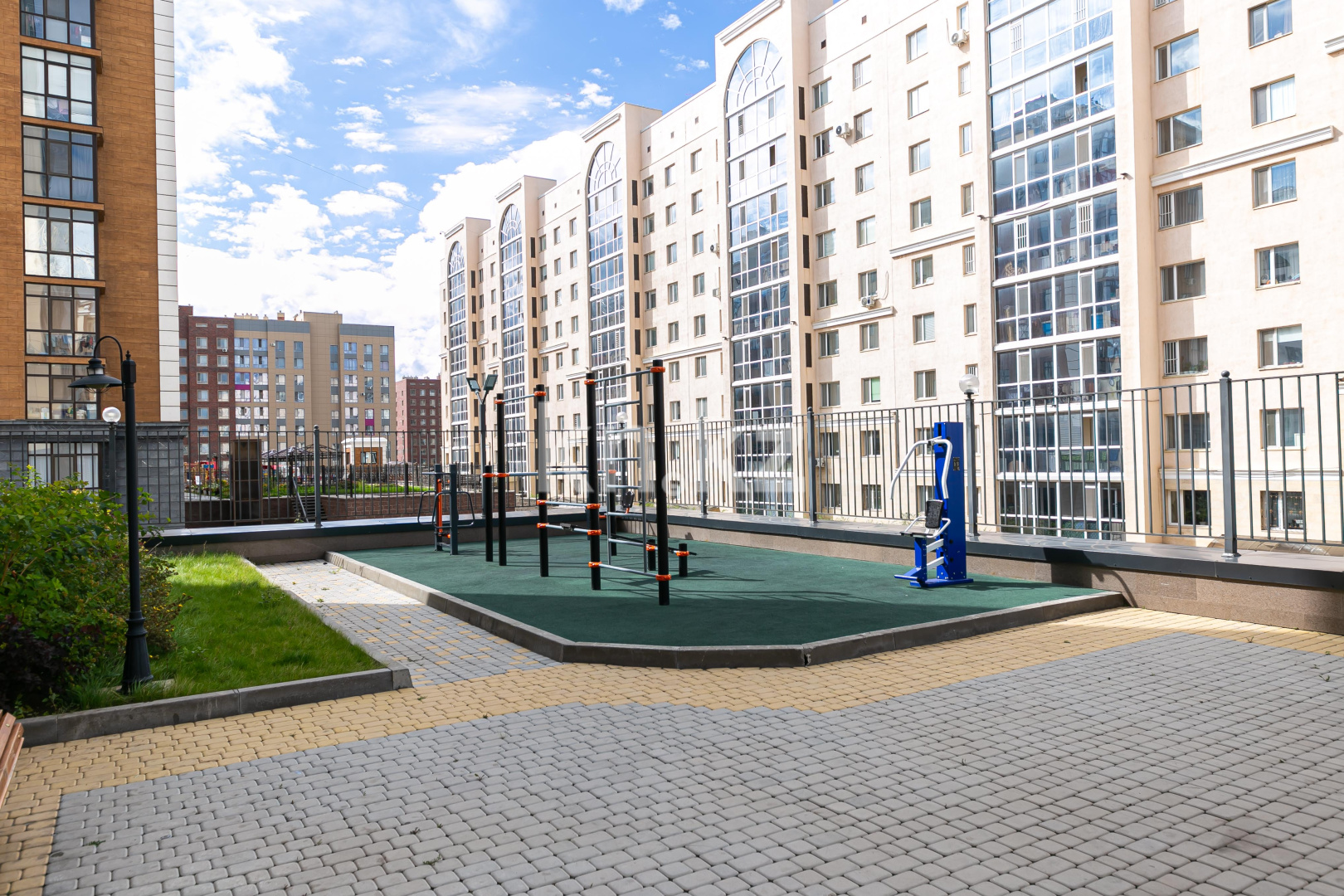 спортивная площадка с уличными тренажерами.