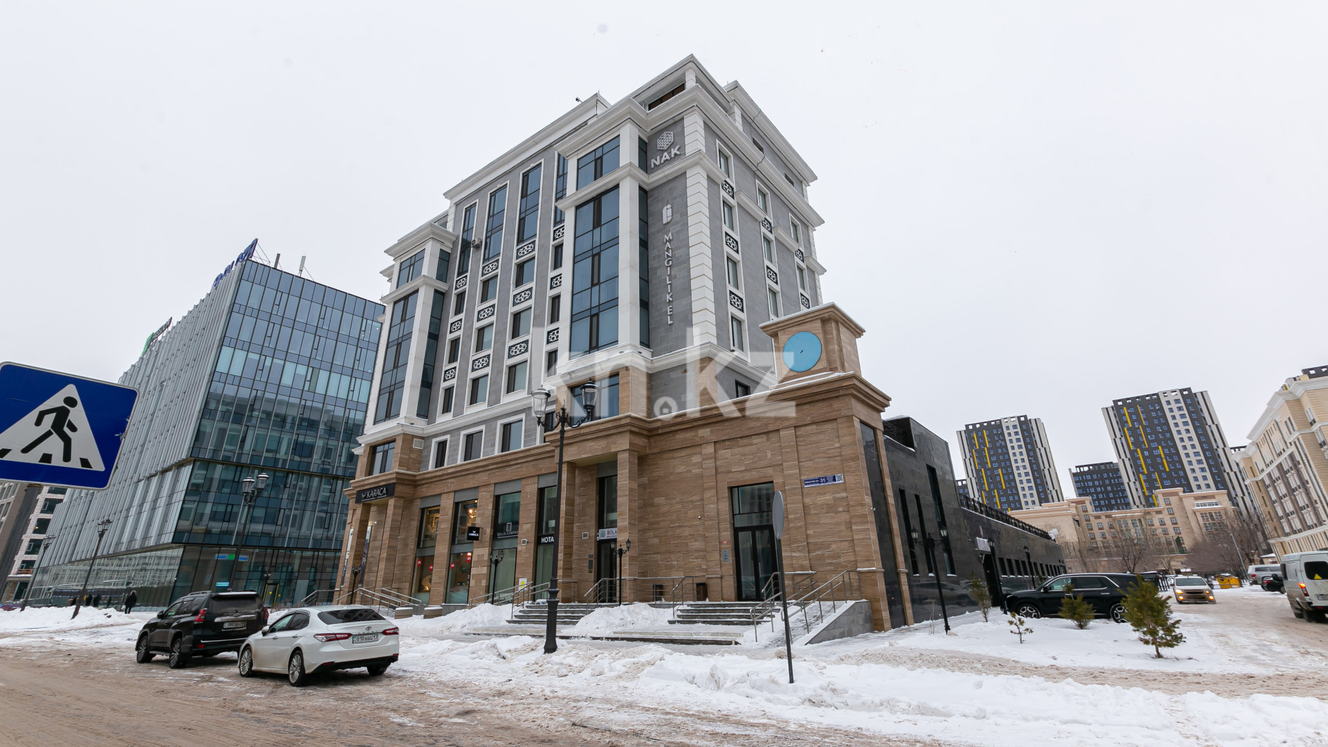 ЖК Mangilik El в Нур-Султане – это здание из двух подъездов, имеющее высоту 7 этажей. Фасады декорированы натуральным камнем – первые два этажа гранитом, а остальные травертином.