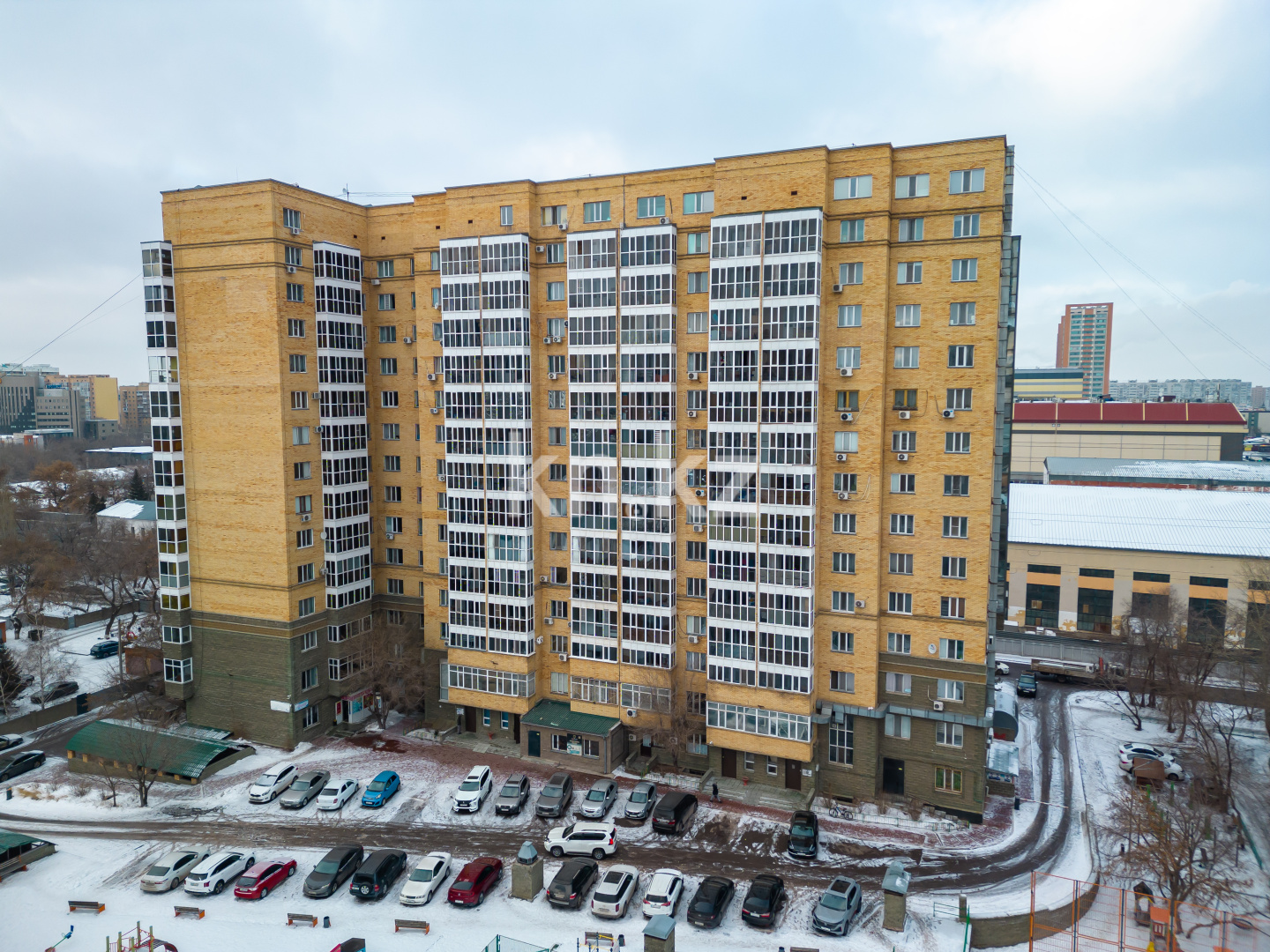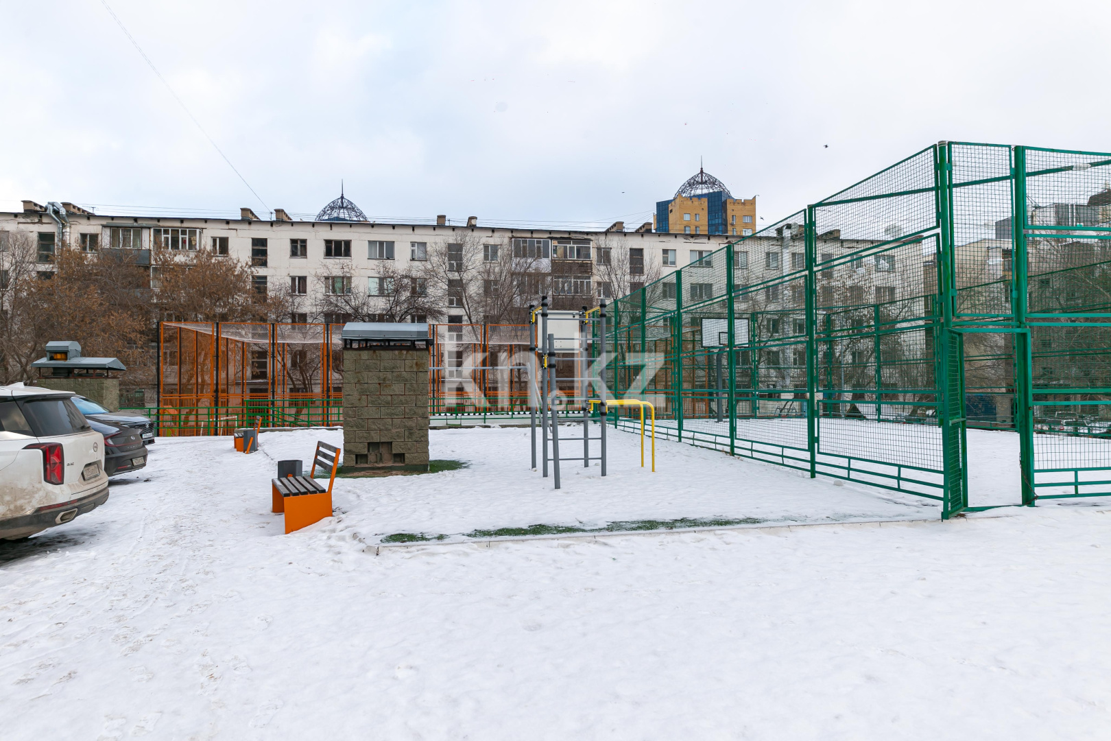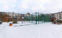 Подняться во двор можно с двух сторон жилого комплекса. В центре находится открытая парковка. Детская и баскетбольная площадки смещены ближе к внешнему периметру дворовой территории. По лестнице в углу двора можно спуститься к детским площадкам других домов.