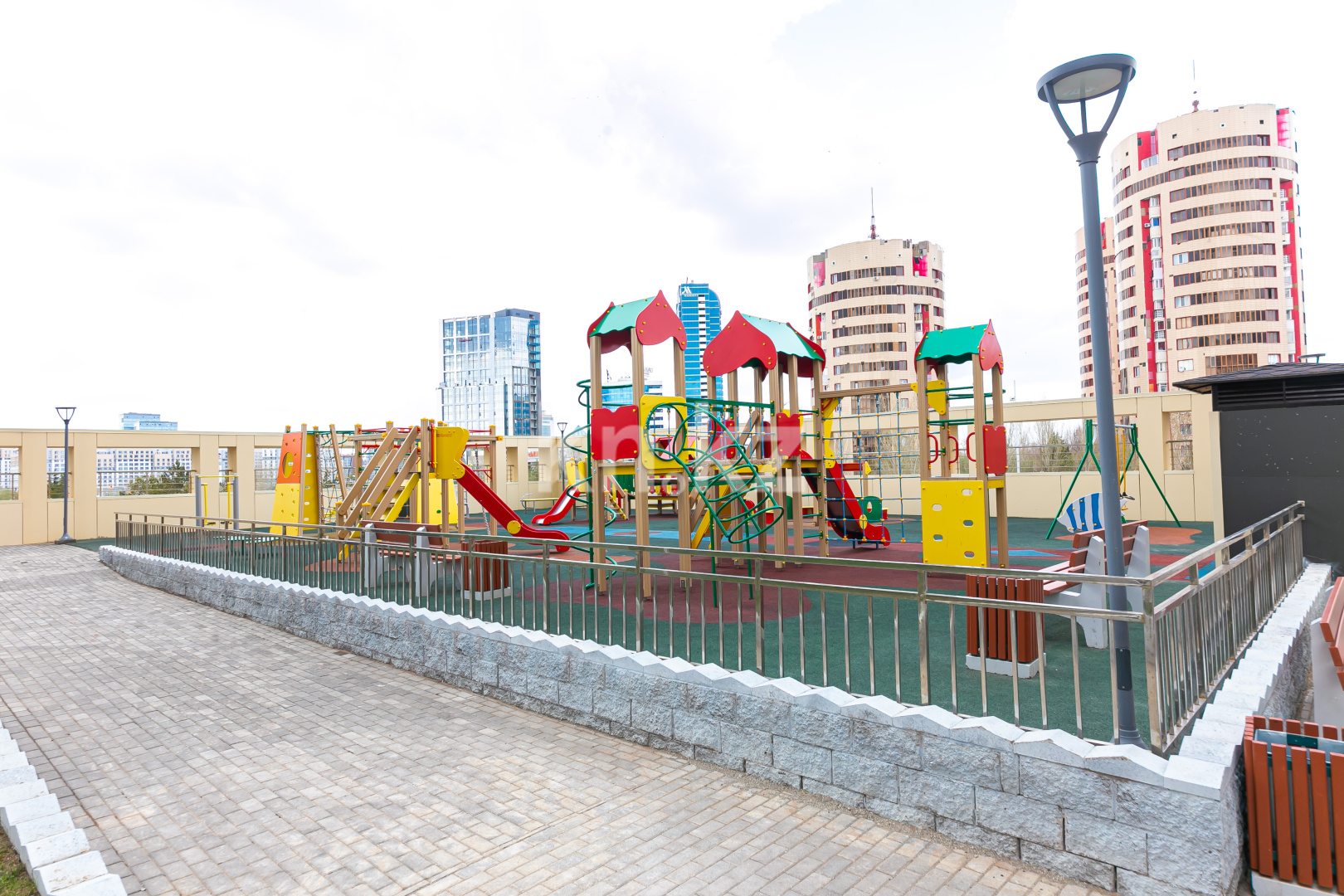 Оцените фантазию и чувство стиля архитекторов, превративших крышу стилобата в уютный, теплый двор защищенный от городского шума и степных ветров. Здесь предусмотрены детские и спортивные площадки, места для отдыха, уютные беседки и аллеи для прогулок.