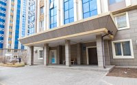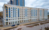 Фасады сочетают витражное остекление небесно-голубого цвета и высококачественное инновационное керамическое покрытие оттенка слоновой кости. Декоративные элементы – стилизованы под национальный узор.