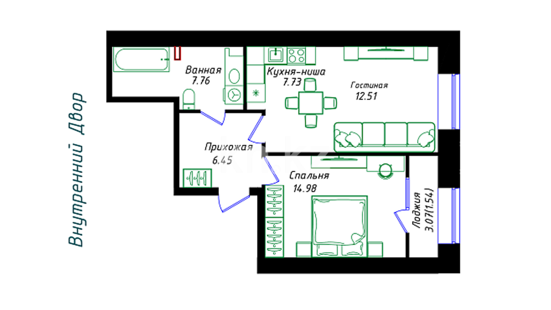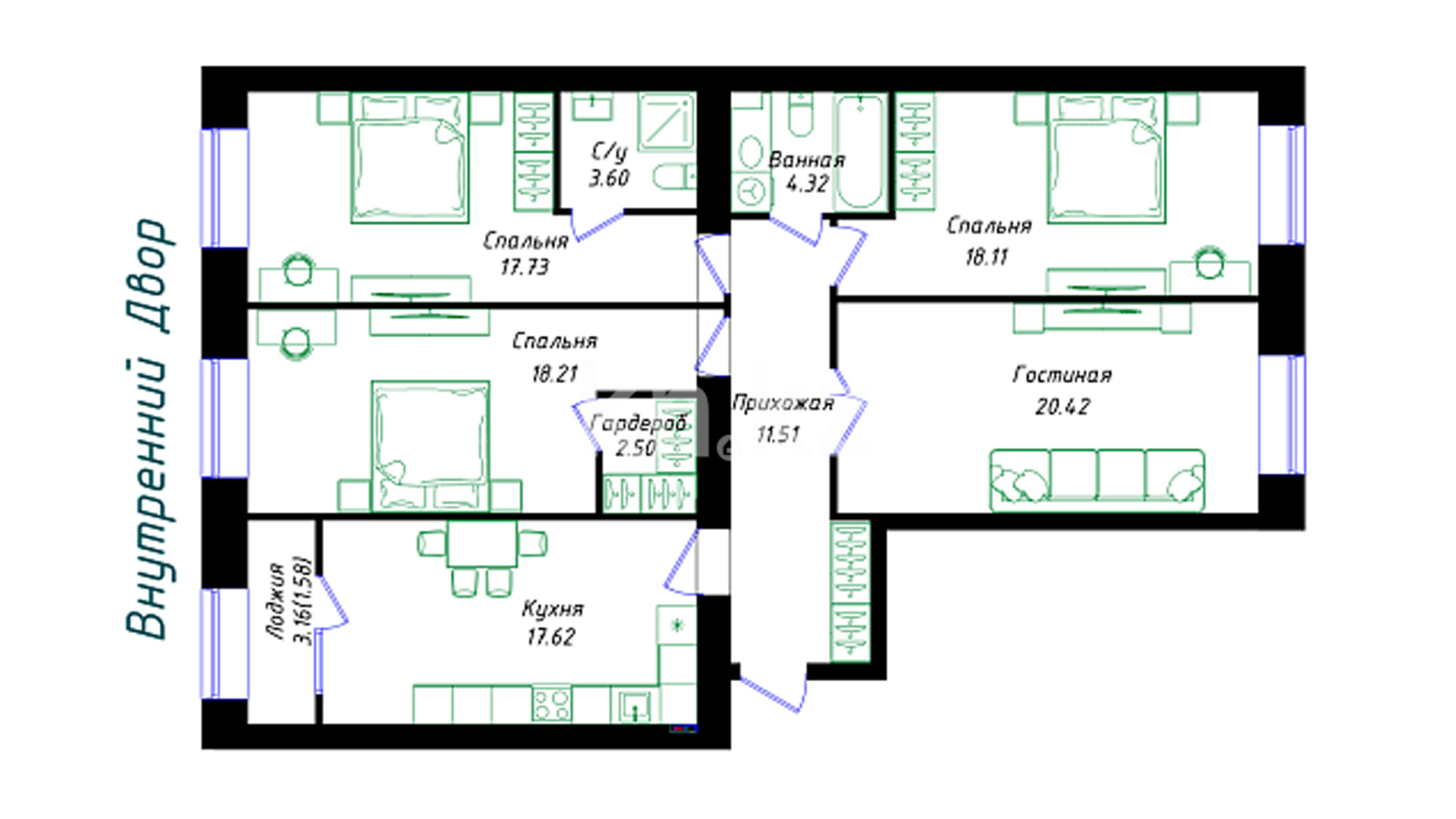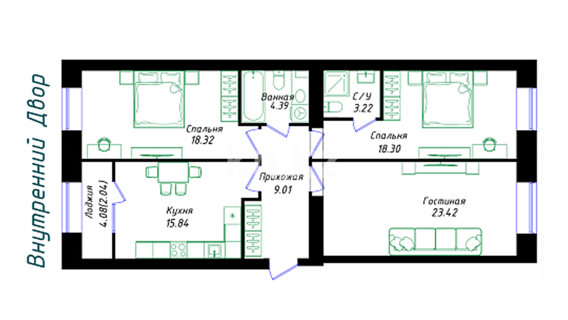 Двор, расположенный на уровне второго этажа, спроектирован как уютное и безопасное пространство для жизни. Здесь предусмотрены зоны отдыха для взрослых, современная детская площадка и спортивная зона — всё для комфорта и гармонии жителей. Территория двора закрыта и надежно защищена.