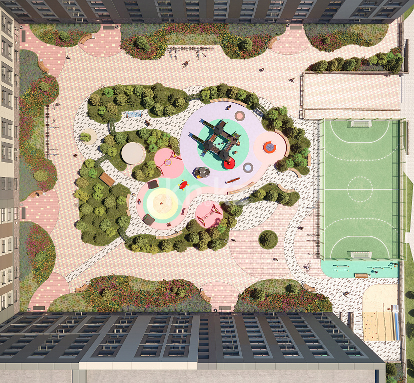 современные площадки с безопасным покрытием, разнообразными качелями, горками и песочницами;
