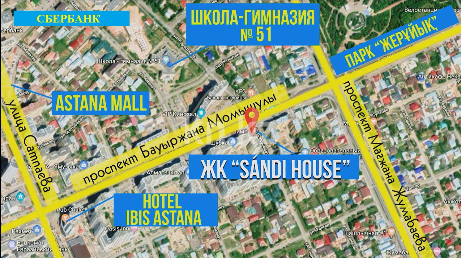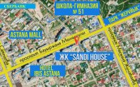 ЖК «Sandi house» - расположен на пересечении пр. Б. Момышулы и ул. Аманат. Хорошая транспортная доступность позволяет быстро добраться до левого берега.