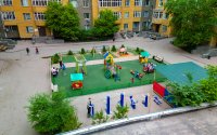 В центре двора находится детская площадка с современными игровыми комплексами, песочница, площадка для сушки белья. Вдоль стен расположены места для парковки машин.