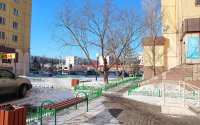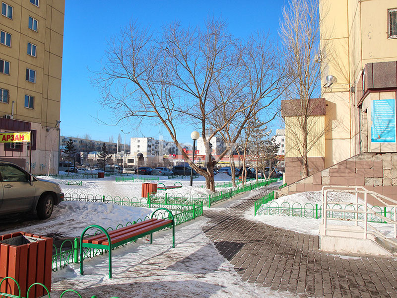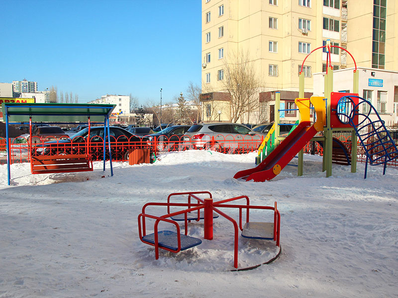 Двор жилого комплекса относительно небольшой. Значительную его часть занимает детская игровая площадка с современными игровыми комплексами. Между домами компактный сквер со скамейками для отдыха.