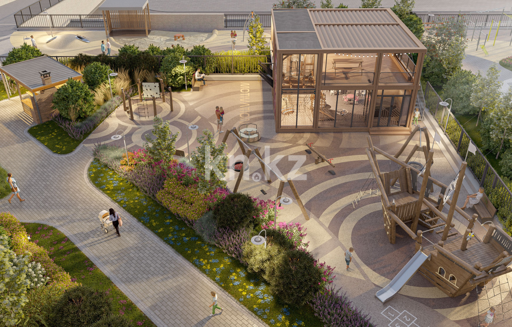 Двор полностью закрыт от проезда случайных машин и посторонних лиц, что обеспечивает полную безопасность и приватность. Для детей будет обустроена развивающая многофункциональная площадка, которая будет интересна как малышам, так и детям постарше. Во дворе дома для тех, кто хочет приятно провести вечер за просмотром кино на открытом воздухе в кругу друзей и близких, предусмотрен проектор.