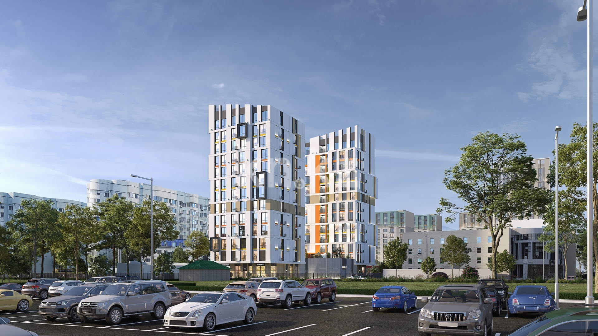 Комплекс представляет собой - две башни, спроектированные по современным архитектурным решениям. Для облицовки были отобраны такие строительные материалы как гранит - 1 этаж, для облицовки жилого фонда предусмотрены hpl-панели и ламель.