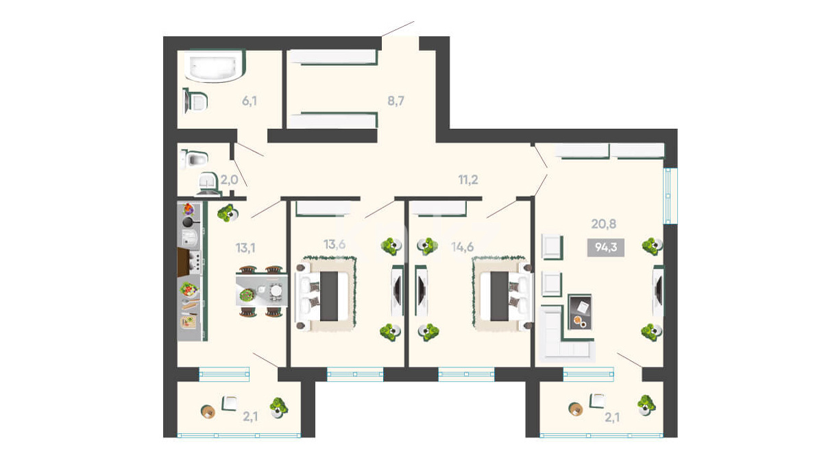 В комплексе представлены 1-, 2-, 3- и 4-комнатные квартиры, площадью от 45 до 108 кв. метров. В каждом подъезде устанавливается современный грузопассажирский лифт. В секциях есть тамбуры. Первые этажи отведены под размещение коммерческих помещений.