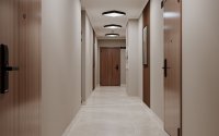 Холлы комплекса оформлены в спокойных, приглушенных тонах с мягким освещением, создающим атмосферу домашнего уюта с первых шагов. Эффективная навигация, современные бесшумные лифты и система видеонаблюдения 24/7 обеспечивают высокий уровень комфорта и безопасности для всех жителей.